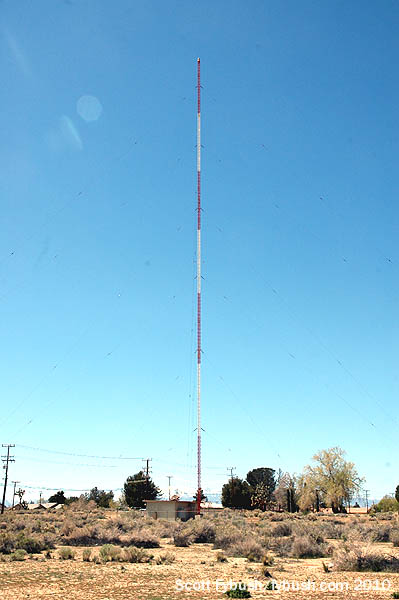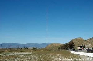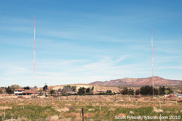 There was once one more AM out here, and that may be the best story of all. In the mid-1980s, legendary LA broadcaster Saul Levine secured a construction permit for KKGO(AM). A sister station to his KKGO-FM, the signal at 540 kHz ran 25,000 watts by day and 360 watts at night from a mammoth array of six very tall towers way out on the side of Highway 247 in Lucerne Valley, east of Apple Valley. After originally being licensed to Hesperia, Levine relicensed 540 to Costa Mesa, 90 miles away but well within reach of the booming directional signal from deep in the desert, and in due time 540 begat an expanded-band partner on 1650 that was actually located in populous Orange County instead of the empty desert. That station eventually moved up to Torrance, in Los Angeles County, where it’s now known as KFOX; 540, meanwhile, eventually went silent up in the desert, though not before spawning a synchronized signal just south of the border in Tijuana, now known as XESURF. The big 540 towers in Lucerne Valley were dismantled and sold off, but a satellite view of the site shows that the old ground system and transmitter building can still be seen. (Someday, we’ll have to go do just that.)