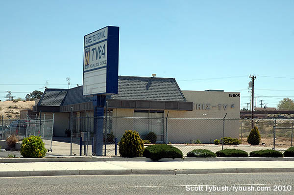 Most of the Victor Valley sprawls out east of the 15, but there’s at least one studio west of the freeway, too. KHIZ-TV (Channel 64) is licensed to Barstow, transmits from a hill north of Victorville, has nominal studio facilities here in northwest Victorville, and tries to serve Los Angeles via the miracle of cable and satellite must-carry. Just down the road from the KHIZ studios, the tower of Victorville’s AM 1590 used to be clearly seen right along the west side of the 15, but the construction of a noise-barrier wall along the freeway a few years back has blocked part of the view. With 500 watts by day and 130 watts at night, the 1590 signal here signed on in 1961 and used to be known as KCIN, KROY and KATJ(AM). It picked up the KRSX calls in part to fend off an unlicensed station in town that was operating on 660 as “Route 66 Radio, KRSX,” circa 2002. (That “Route 66 Radio” operation was a pretty nifty one, actually, playing great oldies with lots of jingles…)