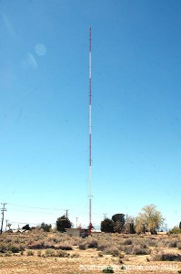 We start with Barstow, the commercial hub of the high desert. a dusty old railroad town where I-40 meets I-15 – and just north of that interchange and downtown Barstow, we find two small AMs. KIQQ (1310) is the Spanish-language AM up here, running 5000 watts by day and 120 watts by night into a two-tower array that sends most of its power up into the desert to the northeast; talker KSZL (1230) has its nondirectional tower and little studio building just to the west on Radio Road. (Every once in a while, you’ll actually see the building here double as a radio studio somewhere else in a TV show or a movie; it’s just scenic enough and just close enough to Los Angeles to have caught the eye of location scouts, it seems.)
