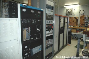 On one side of the room is the Rockwell-Collins phasor and the main Harris DX10 transmitter; that’s an older MW5 aux around the corner, facing the wall of racks on the other side.
