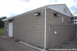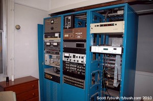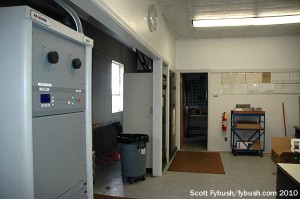 About that building: it’s a nice piece of 1970s-vintage radio architecture, with lots of skylights upstairs and a somewhat unusual rack room setup downstairs: how many transmitter rooms have a nice wall of glass doors leading out to the back parking lot and the towers?