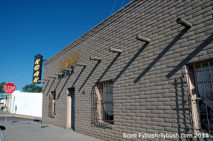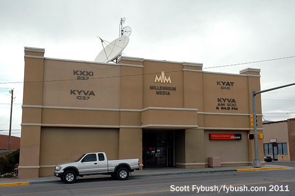 The other AM signal in town came along in 1959: KYVA (1230) transmits from a site just off the north side of I-40 on the east side of Gallup, and it’s part of Millennium Media’s cluster in town, which we find at a modern-looking studio building on Aztec Avenue in downtown Gallup. In addition to KYVA itself, there are the two oldest FM signals in town: KYAT (94.5) started out in 1974 as KOVO, a sister station to KYVA, and had become hot AC “Star” when we came through in 2011, later flipping to all-Navajo as a competitor to KGAK; KXXI (93.7) started out in 1975 as KQNM, a sister to KGAK, and these days it rocks out as “93X.” The third FM here is much newer: KYVA-FM (103.7) is licensed to Church Rock and runs classic hits.