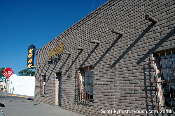 There’s a smaller production studio next door to the big control room (which has since been renovated, I’m told), and there’s a table right in the control room where we ended up eating breakfast that August morning – a breakfast of some of the very finest green chile burritos your editor has ever eaten. The STL tower above the building points more or less due north across I-40 at the buttes just north of town, which is where KGAK’s two-tower array sits. KGAK runs 5000 watts by day, 250 watts at night, and it signs off nightly around 10 PM.