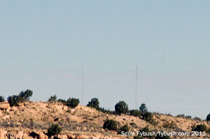 With the exception of KFMQ, whose transmitter site we’d have seen if we’d continued just a little south of the Clear Channel studios, all the Millennium and Clear Channel FMs are up in the mountains at a site about five miles north of Gallup. That site is also home to public radio KGLP (91.7) and to K-Love outlet KLLU (88.9); its EMF sister station KGGA (88.1) broadcasts Air 1 programming from a site near the KGAK towers.