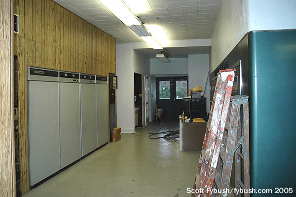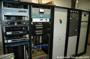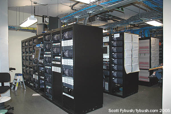 The TV station’s operations are walled off in a separate room of the addition: when we visited in 2005, WKRC-DT was on its interim UHF channel, 31, using a Thomson transmitter in the addition. WKRC-TV was still very much on the air from its Harris analog transmitter on channel 12 back then, in a transmitter room that had been at the rear of the building before the addition went up. After the transition, WKRC-TV went digital on channel 12, and I have no idea what the configuration looks like here now, which probably means it’s time for another visit!