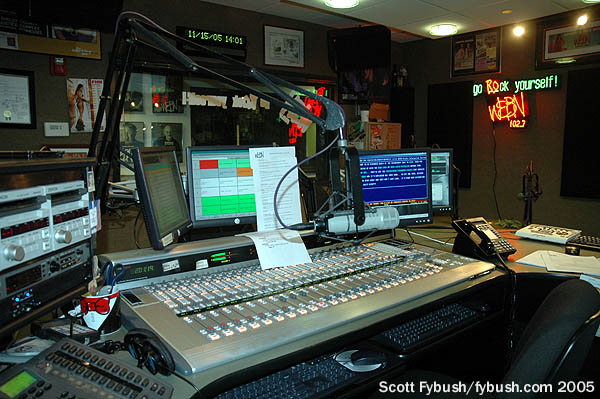 Next to WEBN was top-40 “Kiss” WKFS – and then completing the FM leg of the “U” were the studios of WVMX and WOFX-FM. I list those in past tense, because they’re no longer at this facility. When Clear Channel went private in 2008, it was forced to sell two of its Cincinnati stations to stay under non-grandfathered market ownership caps, and so 92.5 and 94.1 went to Cumulus, which paired them with its existing cluster of three FMs. By then, 94.1 had changed calls to WNNF, and it’s been through a series of formats over the last few years, most recently flipping to country at the start of 2012.