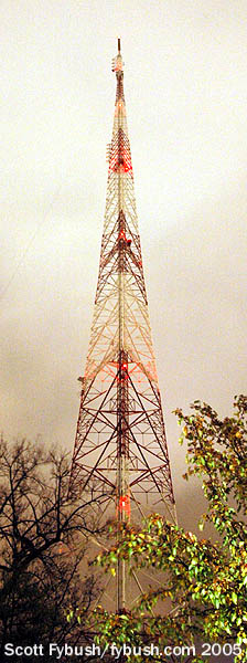 A tornado on March 10, 1986 damaged the remaining 350′ Blaw-Knox tower, requiring the addition of a second level of guy wires to torque the tower back to its original position.