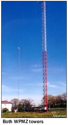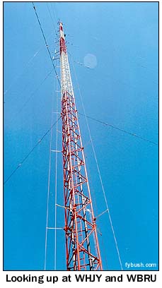 This is an unusual site indeed: its two towers are used by 1110, which operates from a skirt on the tall (548') tower and uses the entire shorter tower (180' or so) as part of its 5000-watt daytime directional array. But on top of the tall tower are two unrelated FM stations: Clear Channel's WHJY (94.1) and Brown University's WBRU (95.5).