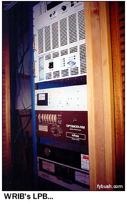 The building itself is nice and compact - walk in and you're facing the studios, a little production room right in front and the main air studio behind it. Look carefully down the hallway at the right and you can just see a couple of folding doors, which Craig opened up to reveal the WRIB transmitters: a little LPB for night use (166 watts) and a vintage Nautel for daytime (1000 watts).