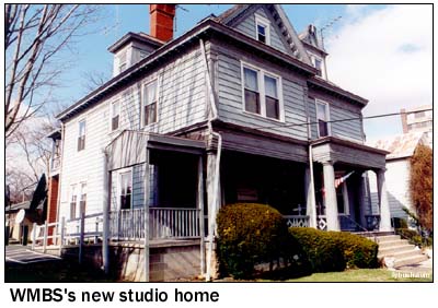 Clarke remembered an impressive "W M B S" sign outside the old studios, and any question about its fate went away when we drove south to PA 857 and the two-tower transmitter site; as you can see below, the sign was simply mounted on the transmitter fence! WMBS uses that big self-supporter all the time; it adds a little guyed tower to create the three-lobed night pattern.