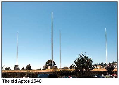 Ten miles or so to the east of KSCO, right alongside coastal Highway 1 near Aptos, sits one of the more unusual directional arrays out there. These four aluminum towers look more like flagpoles, and it's my recollection that at one time, years ago, they even had flags flying from them. Back then, these towers were home to KMBY, operating on 1540 and licensed to Capitola, California. It had a pretty good signal - 10 kilowatts day and night - and that, ironically, is part of the reason it's no longer on the air. In 1998, KMBY went silent, its license deleted at the behest of Westinghouse (later Infinity), which struck a deal to take 1540 off the air to enable a dramatic signal upgrade to what was then KPIX on 1550 in San Francisco. It was to have moved to the South Bay, with a new transmitter site in Milpitas cranking out 50 kilowatts. NIMBY issues have prevented that upgrade from taking place, but that didn't make 1540 down here any less dead, and so for almost eight years these towers have been sitting silently between a hotel parking lot and a golf course. JUST RELEASED - it's your very first chance to order the 2006 Tower Site Calendar! Click here for ordering information!