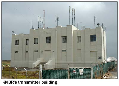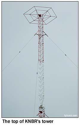 (This tower, though often referred to as a "Franklin" antenna, is not in fact a true Franklin. That designation, strictly applied, refers only to a half-wave segment stacked upon another half-wave segment, and there is one of those - two, actually - in California. We'll see that in next week's installment.) KNBR has used its present calls since 1960, when the KNBC calls were moved south to NBC's Los Angeles TV station. It's been a sports talker since the late eighties, when NBC sold its radio operations and the station passed first to Emmis and then to Susquehanna. For most of that time, KPO/KNBC/KNBR had company out here on the edge of the bay, in the form of the shortwave station that signed on next door in 1941. Originally owned by General Electric, the station used calls that included KGEI. After the war, this was one of just two shortwave stations that returned to private operation (the other was WRUL in Scituate, Mass.), and for a half-century KGEI broadcast programming to South America and Asia from this site at Redwood Shores. In 1995, Far East Broadcasting Company closed the "Friendship Station," and today the antennas are gone and the building (seen in the foreground in the photo at the top of the page) is used by a church.
