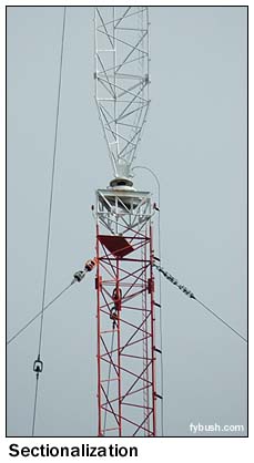 Under its original calls of KPO, the station began as the radio voice of the Hale Brothers department store, gradually increasing power from 50 to 5,000 watts. In 1932, the station was leased out to NBC (which would soon buy it outright), and in 1933 KPO built this site in Belmont, on the eastern shore of the peninsula south of San Francisco. The original installation used two self-supporting towers with a wire antenna strung between them, and I'm nearly certain that what's now the KNBR auxiliary tower, seen at right in the photo above, is one of those two towers. In 1949, the station (by now using the calls KNBC) replaced one of the old towers with a 550-foot guyed tower, the same one that's still in use 56 years later as the main tower. This is a most interesting tower for several reasons: first, it's unusually short for a class I station on 680 (KPO was initially a class I-A facility, but was broken down to a de facto I-B when additional fulltime stations on 680 were authorized in North Carolina and Massachusetts after the war), and second, because it's got an insulator about two-thirds of the way up the tower.