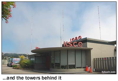 ![]() October 21, 2005 Three Northern California AMs: KNBR, KSCO, KMBYBy SCOTT FYBUSH We've finally worked our way through most of the nifty sites we saw in June on our weeklong swing through New England, so beginning this week we'll turn our attention to the opposite coast, as we recap some of the highlights of a late-July visit to northern California, our first visit there in several years. ![]() In this week's installment, we'll make some quick drive-by visits to a few sites that, for whatever reason, we didn't get a chance to visit in more detail, beginning with what's arguably the very best AM signal in San Francisco.