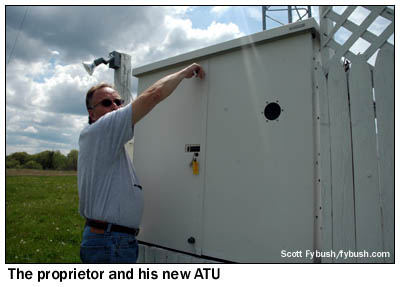 Another visit the next summer found plenty of progress toward the big power increase, including a new Kintronics phasor in the new transmitter room, new transmission line laid out across the field, and new high-power ATUs at each tower base.