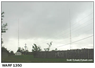 These days, WJMP plays second fiddle to its sister FM station, WNIR (100.1), which has established itself as one of the most successful FM talkers in the country with an all-local lineup aimed at the greater Akron area. As for the AM, it's doing sports, the latest in a long line of formats that has included "TV on the Radio," a simulcast of two co-owned LPTV stations serving Akron and Cleveland. Both WJMP and WNIR have their studios in the building next to the towers, which is next to a golf course on the outskirts of Kent, on Route 59 east of town. We'll close out this installment of Site of the Week with a look at two more AM sites in nearby Akron. Follow Route 59 west, as we did, through the tony Akron suburbs of Stow and Silver Lake, cross Route 8 (the busy connection between Akron and Cleveland), head up through Cuyahoga Falls on State Road, and you'll soon arrive at the two-tower site of WARF (1350 Akron), Clear Channel's progressive talker.