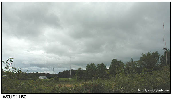 Keep going north on State Road, stay left when Quick Road splits off to the west, and turn left again on Bellaire Lane, and you'll end up at the final site we saw that cloudy September afternoon. It's hard to fit all six towers of WCUE (1150 Cuyahoga Falls) into a single frame - almost impossible, in fact - but look closely and you can at least make out five of them in this picture. These six towers pump out 5 kW by day, 500 watts at night, and these days WCUE is an outlet of Oakland-based Family Stations, Inc., serving both Cleveland and Akron, though with a very tight directional pattern that misses significant portions of both cities' suburbs. There are more Akron AMs that we didn't see this trip, and in a later installment we'll take close looks at WHLO (640) and WAKR (1590), west and south of downtown, respectively. But first, we're getting geared up for our big recap of our autumn 2006 Big Trip, featuring the stations of Oregon and Washington State. Stay tuned...