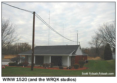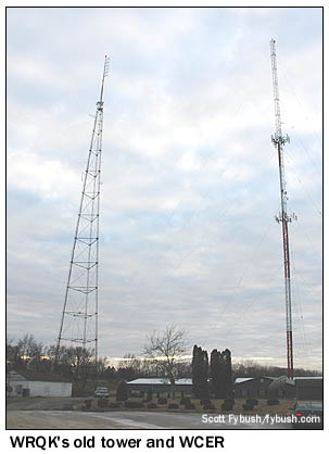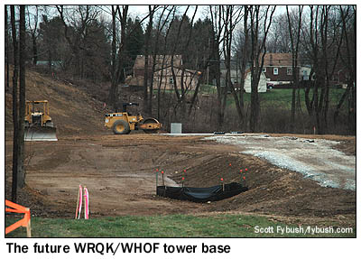 "WIN-Wonderful" was Canton's last new AM signal, signing on in the mid-sixties. It was once a pretty major player on the Canton Top 40 scene, but in recent years, it's been a less visible part of the local radio picture, broadcasting black gospel and religion from sunrise to sunset. Those four towers push WINW's kilowatt of power straight south, into Canton and away from another 1520 signal just 22 miles away - but we'll get to that in a moment. As for the building, it hasn't been home to WINW's studios for years, but when we drove by, it was still home to what was once WINW's sister FM station. WRQK (106.9) was going through some big changes last fall, moving from its old self-supporting tower at 22nd Street and Whipple Avenue on Canton's northwest side to a new guyed tower next door, changing owners from Cumulus to Clear Channel, and changing studio locations from Martindale Road to Clear Channel's Freedom Avenue facility in North Canton. That studio - and the new WRQK tower - became home to another new station after our visit, when the former WJER-FM (101.7) moved from Dover, 25 miles south of Canton, to North Canton, becoming WHOF ("Hall Of Fame" city, remember?) as "My 101.7." In the meantime, we can at least show you the clearing next to the old tower where the base for the new one had just been poured when we stopped by in mid-December - and we'll have to stop by again on our next trip to get some pictures of the finished product.