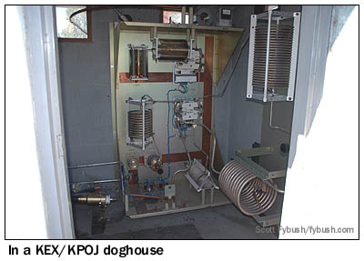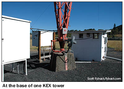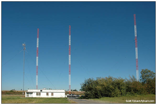 Oaks Park is both an amusement park and a venerable transmitter site: it was home, back in the thirties, to KWJJ on its original frequency of 1040. In 1948, KWJJ, by then on 1080, moved its transmitter north to Smith Lake, just south of the Columbia River. (We'll catch up with it again later on in our travels), and the next year, Oaks Park became home to KLIQ (1290), which would become the longest-running tenant here. KLIQ eventually changed city of license to Lake Oswego moved south and east to the 1520 Oregon City (then KYXI, now KGDD) site, before finally going dark a couple of years ago in favor of a new expanded-band AM, KDZR (1640) - and we'll catch up with that one, too, later on. Meanwhile, the construction of the Stonehenge tower in 1990 displaced the station on 1410, which had gone from KPAM to KCNR to KKUL to KBNP over the years, and it ended up at Oaks Park, where it remains today, as KBNP, with 5000 watts by day and 9 watts at night. Another brand-new AM arrived here in 1993, licensed to Tigard and operating, ironically enough, on the same 1040 frequency that started it all back in the thirties: KEZF became KLVP, was owned for a while by the "K-Love" folks, and is now regional Mexican as KXPD. From here, we zip south and east through Milwaukie and across I-205 to SE Lawnfield Road and the most powerful transmitter site in Portland, not to mention perhaps the most historic one still standing. If you've only ever heard of one Portland radio station, this is probably the one: 50,000-watt KEX (1190). ![]() When KEX arrived at this site in 1948, it was already an established player in Portland radio, having been founded in 1926. In 1933, it became a sister station to the Portland Oregonian's KGW (620), and in 1935 it began sharing a transmitter site on North Denver Avenue, just south of the Interstate Bridge, with KGW. KEX moved about the dial, going from 1180 (where it was sharing nights with KOB in Albuquerque) to 1160 in 1939, to 1190 in 1941, protecting (and being protected by) WOWO in Fort Wayne. The FCC's mandated end to local radio duopoly forced a 1944 sale to Westinghouse, which just happened to also own WOWO, and once the war was over, KEX powered up from 5 kW to 50 kW DA-1, inaugurating this new site with its three 455-foot Blaw-Knox towers and, of course, a Westinghouse 50-HG transmitter.