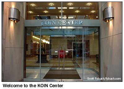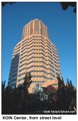 The map shows me now that the KLOR studios, during its brief 1955-57 run, were at 915 NE Davis, just a few blocks from KBOO's current home, but I suspect little is left of the place half a century after the fact. (I've since been told, by the good folks over at pdxradio.com, that the KLOR building is in fact still there - one more reason to make a return trip to Portland!) There's one more significant stop to make on the east side before our tour with Kent is over: Benson Polytechnic High School sits on a nine-acre campus just south of I-84 on NE 12th Avenue, and it has a long, proud broadcasting history. KFIF signed on here in 1923 as one of the first high-school stations in the country, and under new calls KBPS ("Benson Polytechnic School"), it's been part of the Portland Public School District's communications program ever since. There's a KBPS studio building on the east side of the campus, facing NE 15th Avenue, and while it proclaims both "AM" and "FM" on the facade, there's little connection between KBPS (1450) and KBPS-FM (89.9) these days. The AM side remains licensed to the school district, with its transmitter right there on the Benson campus and its studios in the school. During the day, students run the station as part of the educational program, with a format aimed at kids (think Radio Disney without all the Disney promos), and at night, the airtime is leased out to Portland State University's campus station, "KPSU," which also has a fulltime webcast and a low-power campus FM presence on 98.3. KBPS-FM, meanwhile, operates from the 15th Avenue building, with transmitter at Sylvan, and it's now owned by the KBPS Public Radio Foundation, which programs an all-classical format there. With deep thanks to Kent for his tour-guide services, we say our farewells at this point and make our way downtown for one more tour before dinner: KOIN (Channel 6) occupies part of one of the most distinctive parts of the Portland skyline. In 1984, KOIN sold the land under its former studios at 222 SW Columbia, on the southern edge of downtown, for the construction of the 509' skyscraper now known as the KOIN Center.
