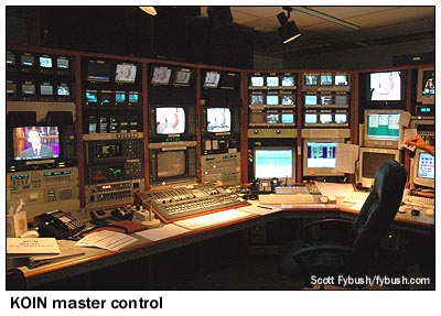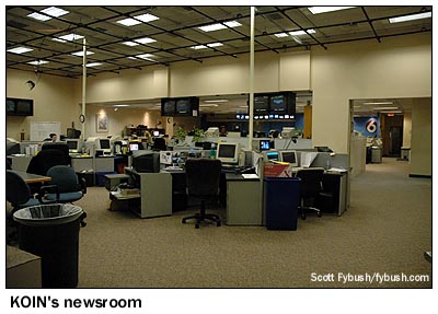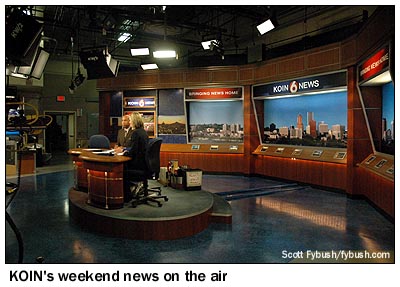 KOIN itself remained in the building, with a small lobby just behind the main entrance to the building (those are the doors just to the right of the elevator bank in the photo above), and most of its facilities on three floors below street level. We get to see them this Sunday evening thanks to a fellow Rochesterian, KOIN chief meteorologist Jeff Baskin, who just happens to be a childhood friend of your editor. (And the Rochester connection continues: weekend anchor Ken Boddie, seen at left in the photo below, also got his start in upstate New York, working at WHCU in Ithaca and WDKX in Rochester.) The main air studio and newsroom are next to each other, way down at the bottom of the building, as it were, and the absence of windows is somewhat made up by those nice high ceilings and plenty of space, somewhat unusual in a newsroom these days. Though we don't see them on this visit, there are radio stations in the KOIN Center as well: CBS Radio now owns the former KOIN(AM), now KCMD (970), and it shared space with sister stations KUPL-FM 98.7 and KLTH 106.7 on the second floor of the tower until moving out in February. (KUPL and KLTH are still there.)