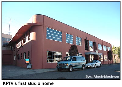 KPTV is long gone from there, after an action-packed history; after an affiliation swap with KGW made KPTV an ABC affiliate in 1959, the debut of KATU (Channel 2) in 1962 soon turned KPTV into an independent. It became a charter Fox affiliate in the mid-80s, but after disputes about carrying low-rated weekend Fox offerings (this was decidedly pre-Simpsons and pre-NFL!), KPTV went back to independent status in 1988. In 1995, it joined UPN, and in 1996, it left SW 20th Place after 43 years, building a fancy new studio at 211 SE Carruthers, on the east bank of the Willamette River south of downtown. That's the building you see at right - but KPTV's not there, either, and neither is the huge neon "12" sign that was in the glass tower along the river. (You can see that on the "Yesterday's KPTV" site, too.) In 2000, Chris-Craft (which had owned KPTV since 1960) was sold to Fox, but KPTV didn't come along for the ride, getting traded to Meredith in exchange for WOFL in Orlando. Meredith already owned Fox affiliate KPDX (Channel 49) in the market, and in 2002 it moved Fox back to KPTV, consolidated the two stations' rival news operations, and moved KPTV out to the KPDX studios in Beaverton, which we saw last week. (KPDX would eventually migrate from UPN to My Network TV, and today brands itself as "PDX49," wisely eschewing much on-air mention of that struggling mini-network.) So now you know why we were so interested in seeing the SW 20th Place building, which still (to us, anyway) carries some of that exciting whiff of anything-goes early local TV, however much it's been renovated in the interim.
