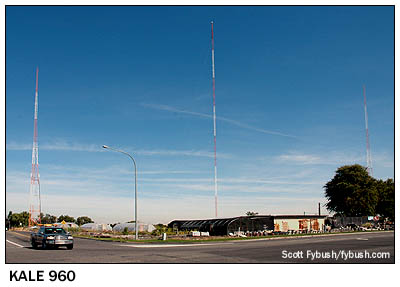 We have one more Pasco stop before heading across the river into Kennewick: on the west side of town, behind a nursery shop, we find the three towers of New Northwest Broadcasters' KALE (960 Richland), which does sports as "K-Jocks" with 5 kW days, 1 kW nights, DA-N. (New Northwest's studios are in an office park on the west side of Kennewick; it also owns country KIOK (94.9 Richland), classic rock "Eagle" KEGX (106.5 Richland), top 40 KUJ-FM (99.1 Burbank), adult hits "Bob FM" KNLT (95.7 Walla Walla) and talk KTCR (1340 Kennewick), the market's oldest station. (Even at that, KTCR came on only in 1945; it was the Cold War growth of the nearby Hanford Nuclear Reservation that fueled much of the growth here, and with Hanford now closed, this market is again in a bit of a decline.)