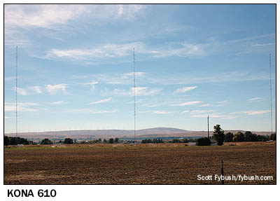Instead, we make a stop for lunch at a fifties-themed burger joint near the KNDU studios, then head east through downtown Kennewick and south along the river to the three-tower array of KONA (610), which puts out 5 kW day and night, DA-2.