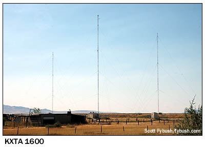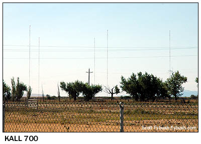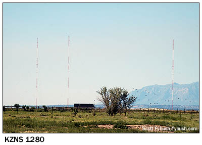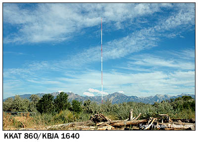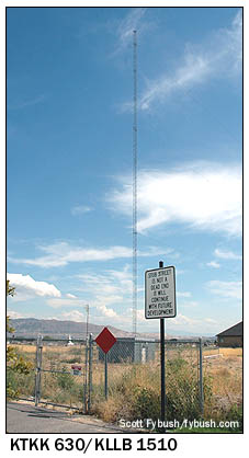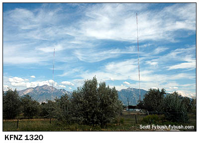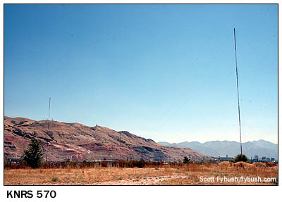 North of downtown Salt Lake, the valley narrows dramatically between the Great Salt Lake and the Wasatch Mountains, leaving just a narrow strip of suburbia along I-15 to divide the northern edge of the Salt Lake City metropolis from the southern edge of the Ogden area. It's no surprise that we find several AM signals taking advantage of the superb ground conductivity along the edge of the lake here, including one of the market's bigger signals. KALL (700 North Salt Lake) runs 50 kW by day and 10 kW by night from five towers just across the line in Davis County. While it's now a sports station, bearing heritage calls that long resided on Salt Lake's 910 AM signal, this was once KWLW, a sister station to the co-channel giant WLW in Cincinnati - and before that, it was KFAM, pumping beautiful music all over the West at night. Just half a mile or so to the northeast of KALL (and directly adjacent to a massive construction project for the new Legacy Parkway project designed to relieve the bottleneck that is I-15 between Salt Lake and Ogden), Spanish-language KXTA (1600 Centerville) runs 5 kW days, 1 kW night from a three-tower array. (It changed calls to KTUB after our August 2007 visit.) Heading south, just north of the I-15/I-215 split, we find another three-tower array, this one belonging to sports station KZNS (1280 Salt Lake City), with 10 kW days, 600 watts at night, and with a CP to move about a mile to the west and boost day power to 50 kW. And continuing south into Salt Lake County on Redwood Road, one of the region's main north-south arteries, we find ourselves at the oldest site on this side of town, the widely-spaced two-tower array of KNRS (570 Salt Lake City). Historically known as KLUB, and later as KISN, this is now a Clear Channel talker (with a morning show hosted via ISDN by Rochester's own Bob Lonsberry, who has strong ties to the Salt Lake area), running 5 kW with a CP to boost day power to 50 kW, which will make this as potent a signal as the area offers, covering even more ground by day than the market's I-A clear channel KSL (1160).