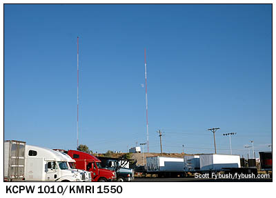 We'll devote a separate installment of Site of the Week to KSL, whose site sits at the southern edge of the Great Salt Lake, a dozen miles or so west of downtown Salt Lake City alongside I-80. Before we get there, though, we'll swing around the western edge of the city to show you some of the AMs out there. Behind a truck stop out along Utah 201, we find the two towers of KCPW (1010 Tooele), which runs 50 kW by day and just 190 watts by night. This began as a local station, KTLE, on 990 in Tooele, out to the west behind the Oquirrh Mountains, then moved east as KIQN, and today it's a public radio station, sister to KCPW-FM (88.3 Salt Lake City) and KPCW (91.9 Park City), and while its intention was to bring KCPW programming to the outlying parts of Utah, it ended up being a financial drain on the KCPW/KPCW organization, which is in the process of selling its Salt Lake signals. The 1010 signal used to come from another site closer to the airport, and when it moved here it began diplexing with another station, regional Mexican KMRI (1550 West Valley City), which runs 10 kW days, 340 watts at night from the left tower in the photo below. (The right tower was built new for KCPW a few years ago; the KMRI tower was built in 1997 when the 1550 station, then KRGO, moved from an older site to the east along Utah 201 (aka the 21st South Freeway). Head east again toward Salt Lake City on that freeway, and just past Redwood Road we find two sites tucked into a rundown neighborhood. One, KSOP (1370 South Salt Lake), we'll explore in greater detail in a subsequent edition of Site of the Week; the other, the single tower shown below, is Citadel's KKAT (860 Salt Lake City). When we visited, its 10 kW day/196-watt night signal was carrying classic country; it's since flipped to the True Oldies Channel.