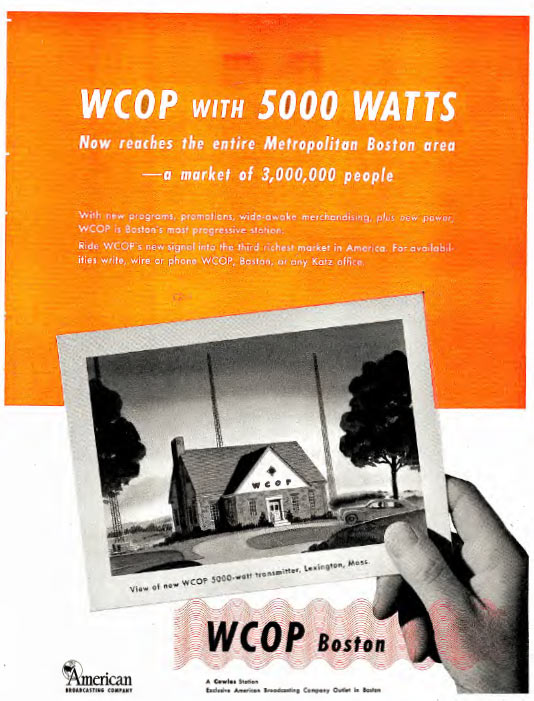 But the post-war AM boom gave WCOP an opening to increase its power to 5000 watts, day and night, and Cowles moved with extraordinary speed to get there, chronicled the whole way with a series of full-page ads in Broadcasting magazine. (You can read them all over at David Gleason’s equally extraordinary archive at AmericanRadioHistory.com, from which we pulled the June 24, 1946 ad above. Go ahead and click on it – or any other image here – to make it bigger!)