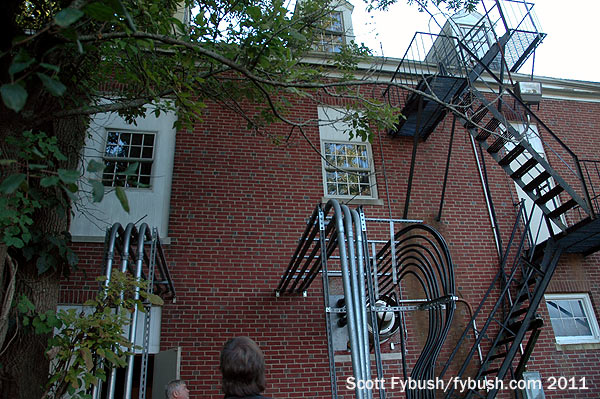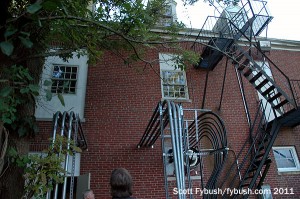 WAZN’s transmitter and phasor both sit down in the basement, where WWDJ’s current phasor also sits. Because of the sloping ground here, this is a two-story building at the rear, so the basement opens right onto the catwalk that leads out to the AM array – and out to where the FM used to be. Today, that big old FM tower sits mostly empty; like the AM towers, it’s owned by American Tower, which acquired this site when its former sister company American Radio Systems bought 1150, then WNFT, back in 1997. (Within months, ARS merged with CBS, creating a Boston cluster that would have been over the cap; 1150 went into trust and was never operated as part of the CBS Boston group.)